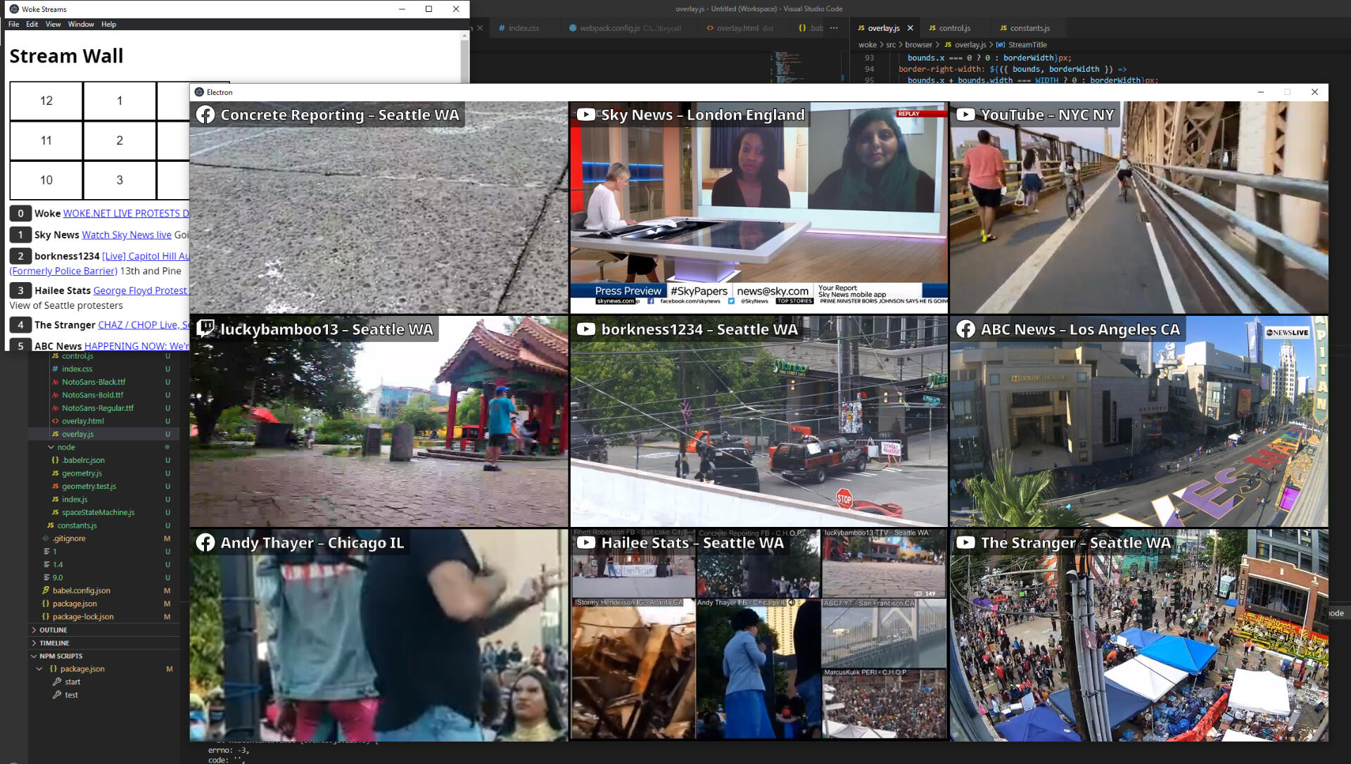 Streamwall composes multiple livestreams into a single feed with source attributions and audio control